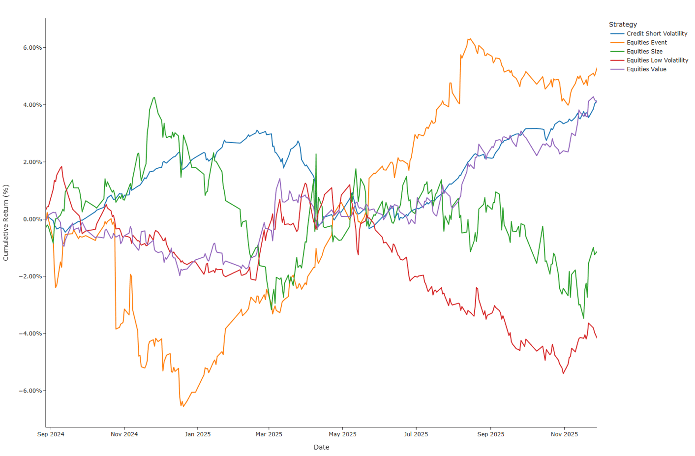 Carry strategies were mostly stable at +0.04%. The bright spots were credit and rates short-volatility premia, which benefitted from calmer markets and declining implied volatility. The weak spot was commodities, where softer energy curves pulled returns lower.