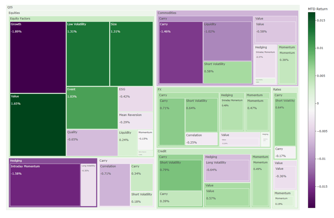 Value strategies and Hedging exposures finished the month in the red, dragged down by commodity value signals and intraday equity strategies that were hit by whipsaw price action.