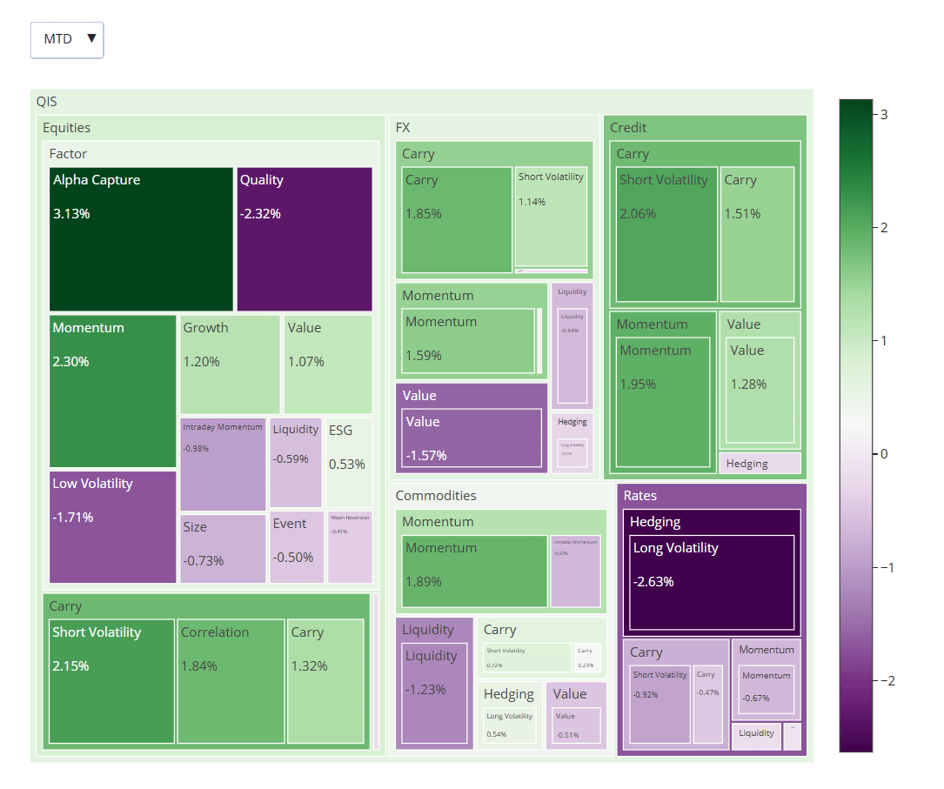 Liquidity: ‑0.68% (0/3 positive) — FX Liquidity (‑0.64%) and Commodities Liquidity (‑1.23%) detracted; Rates Liquidity (‑0.17%) was only marginally negative.