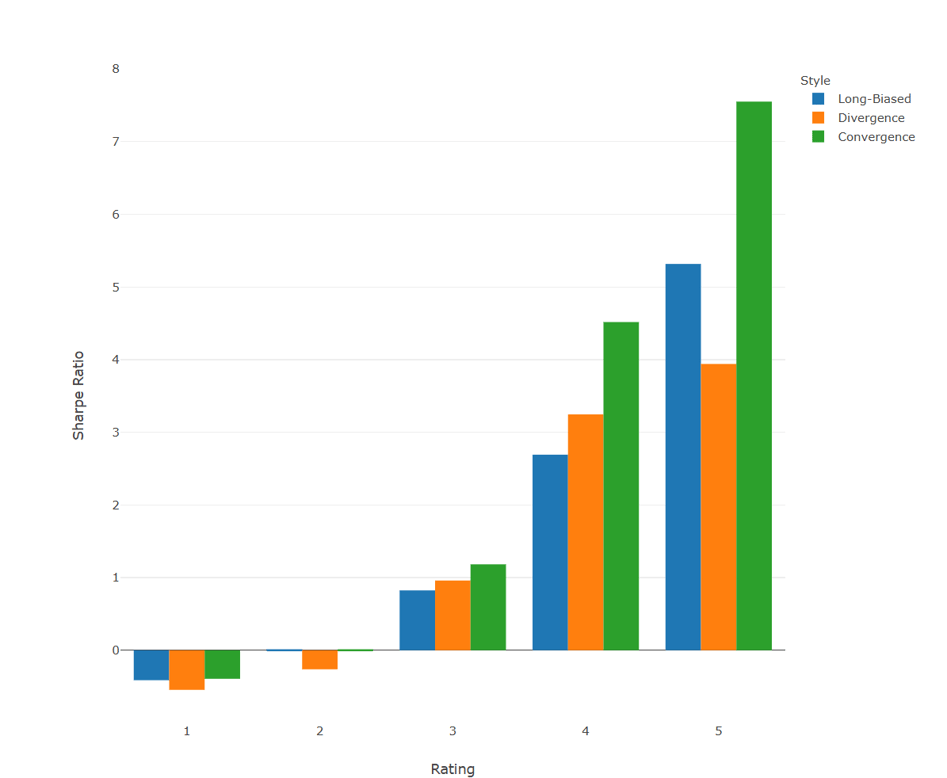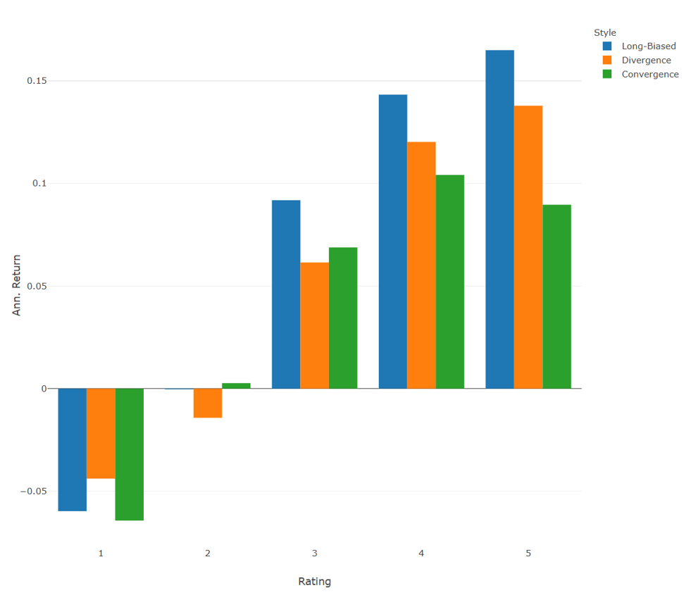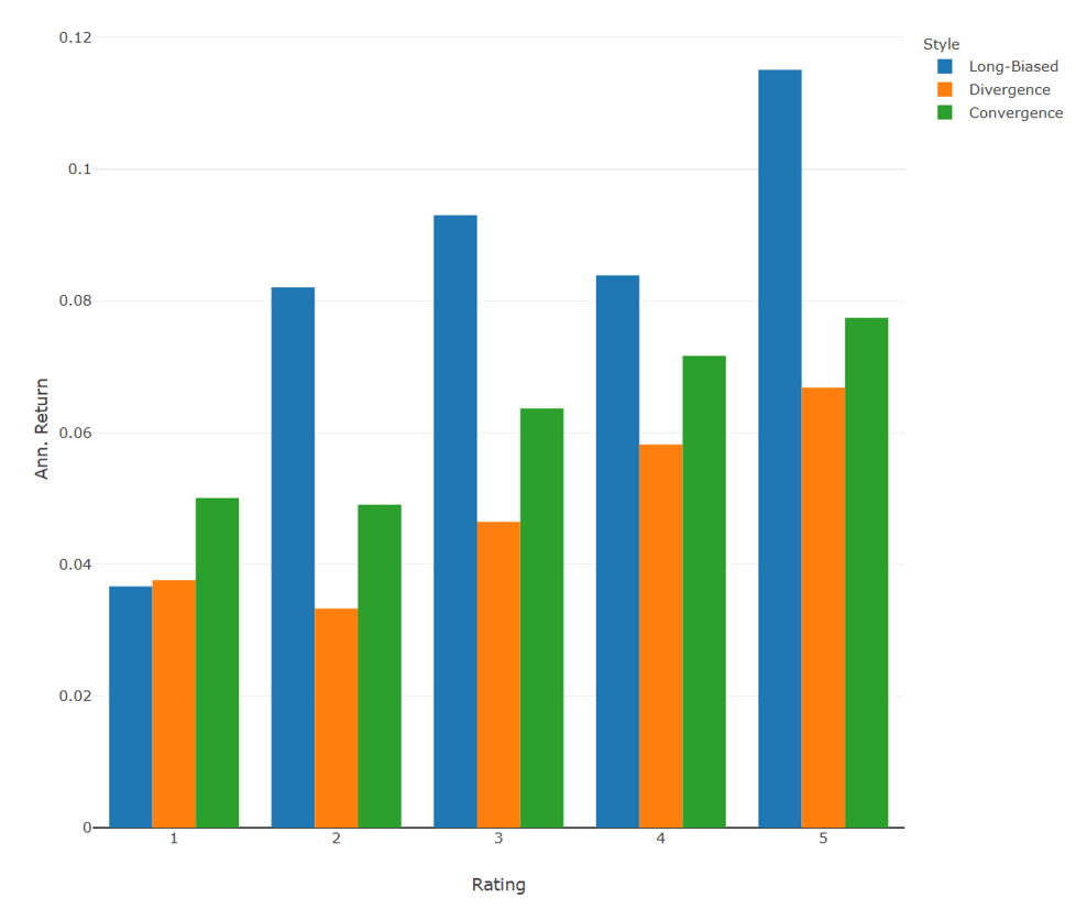 For all buckets, we find that the portfolio of funds with the best ratings has significantly outperformed the respective portfolio of funds with the lowest ratings. There's an almost monotonically increasing pattern, with the only exception being Convergence, where the best-rated funds performed slightly lower than the second-best rated funds. While it seems plausible that better-rated funds have delivered superior returns compared to lower-rated funds, it's important to emphasize that this isn't necessarily endogenous to the rating approach. Given that the rating is based on a ratio between returns and risk, a fund with slightly lower returns but significantly less risk than another could be rated higher. However, we find that funds which have offered an attractive risk-return profile have also outperformed their peers on an absolute basis.